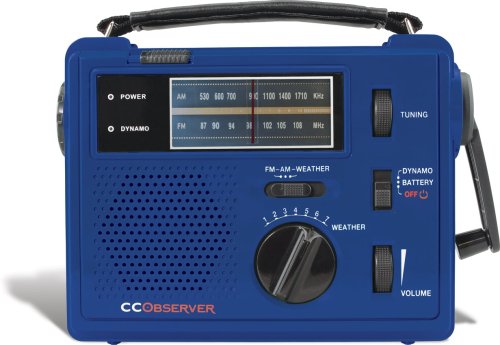 The CC Observer is a wind-up emergency radio. The AM reception is exceptional and there’s an LED flashlight on the side of the radio. The CC Observer runs off of the built-in rechargeable batteries or 3 "AA" alkaline batteries (not included) if preferred. Of course, if you don't have alkaline batteries around, just wind-up the radio and keep it running as long as you need. It can even be used to charge a cell phone. Along with good AM reception, there is also the FM and the Weather band — which comes in really handy when using the radio during a power failure. There's also a stereo headphone jack for private listening.
